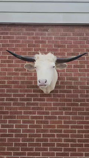 Unique white shoulder mount cow taxidermy with long horns ready to be added to your collection and hang on your wall.